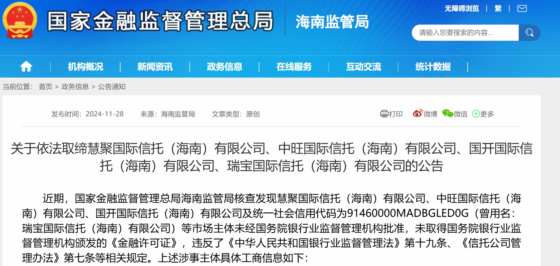 11月28日,国家金融监督管理总局海南金融监管局消息,依法取缔四家非持牌且名称(曾用名)带有信托字样的公司。