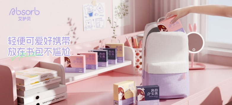 艾护贝提出了“书包卫生巾”的理念,旨在为女孩们在学校使用卫生巾提供更多的便利性和私密性。这一理念考虑到了青春期女孩在校园中面临的实际问题,如厕所私密性不足和月经期间的尴尬,以及月经期间的应急需求。艾护贝卫生巾的包装小巧,易于藏在书包中,让女孩们在需要时能够轻松取用,保持了她们的私密性和尊严。