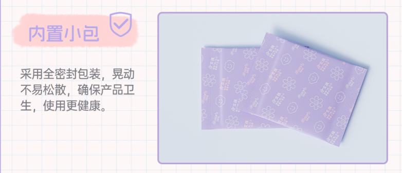 艾护贝卫生巾采用食品级铝塑膜包装,防潮、防污,让父母无需担心卫生巾受潮或污染的问题。这种包装不仅保证了产品的卫生安全,也为女孩们提供了更多的便利性。