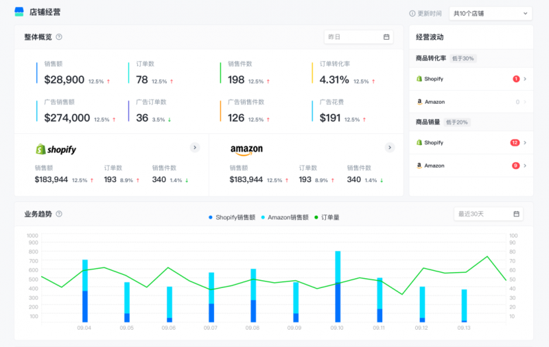 飞书逸途首创的跨平台智能数据看板,结合8800万+全球消费者行为数据,一键聚合亚马逊、独立站、TikTok Shop等多店铺经营数据,以及Meta、Google、TikTok等多媒体平台数据,AI实时追踪转化波动,智能预警潜在问题,助力商家快速应对市场变化,预先捕捉商机。