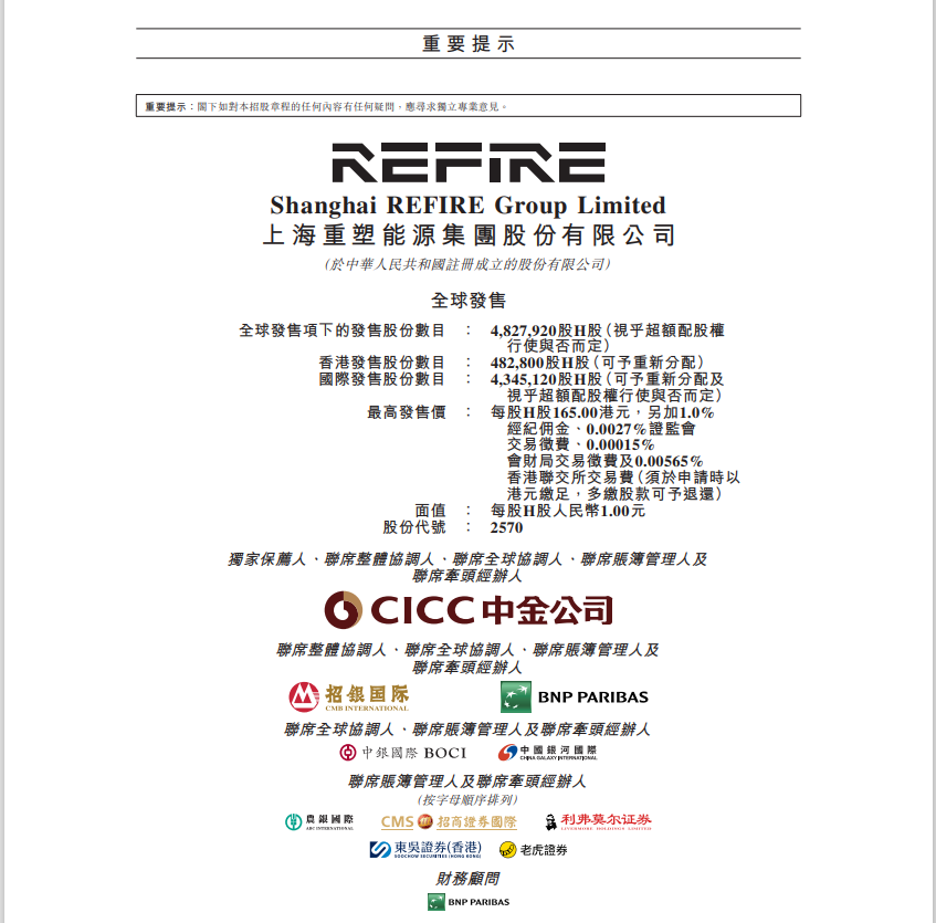 11月28日,重塑能源在港交所披露招股信息,发售价当时定为每股发售股份145-165港元,募资金额达7亿-7.97亿港元(约合7.42亿元人民币)。中金公司为独家保荐人。
