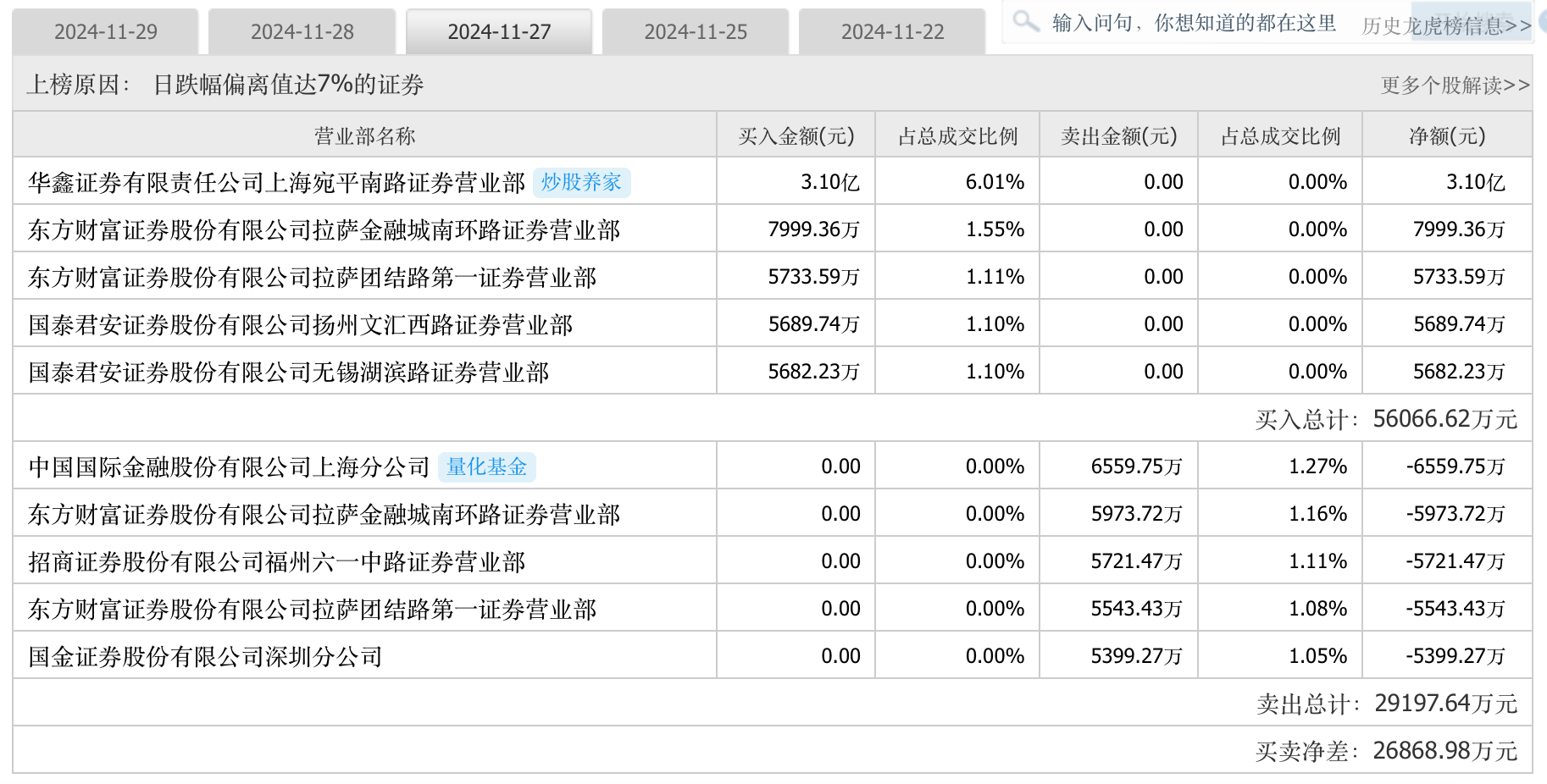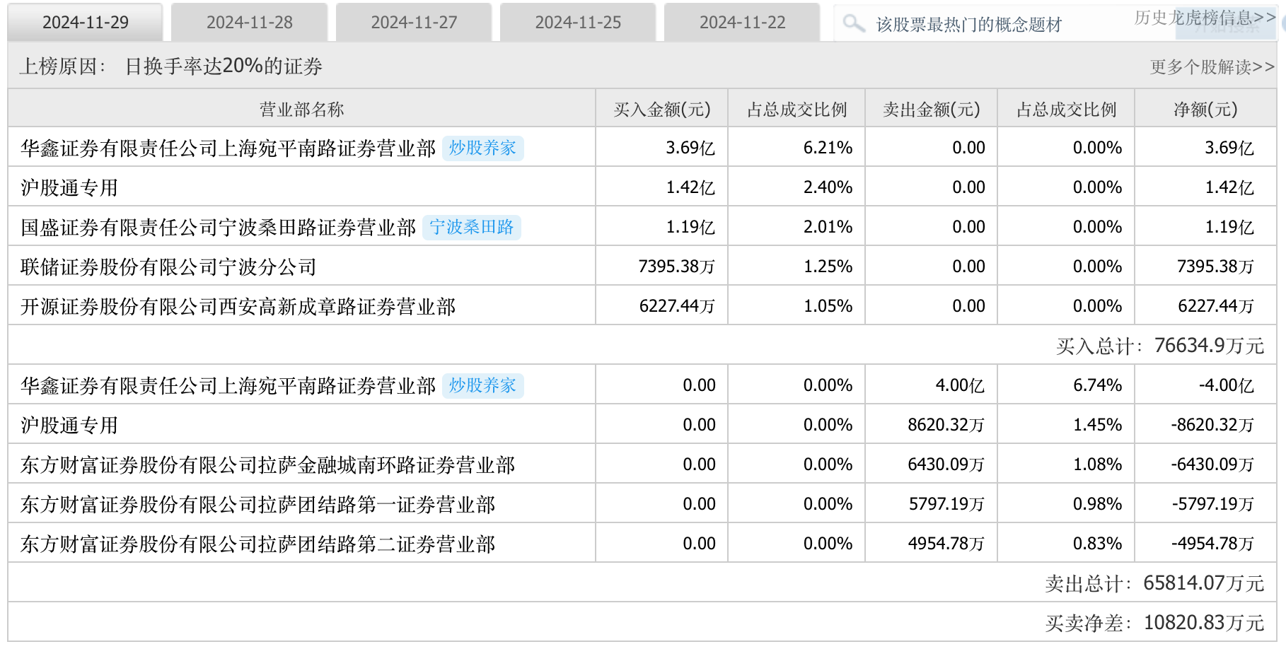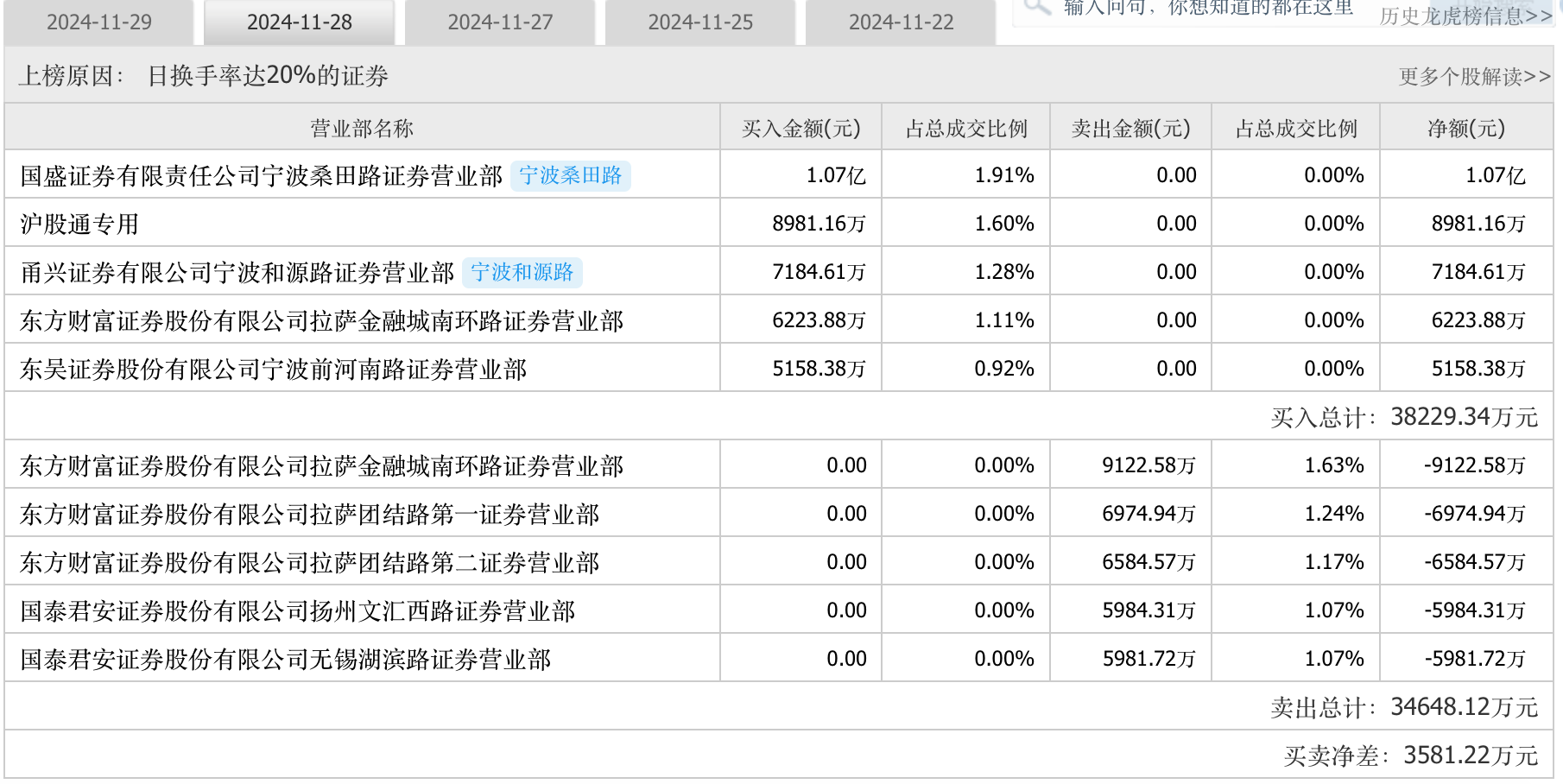 不过东方财富证券拉萨金融城南环路营业部也出现在28日买入前五名单中,一天内“做T”。而11月28日买入最多的则是另一路知名游资:国盛证券宁波桑田路营业部,当天以1.07亿元的买入金额位列买入第一席位。