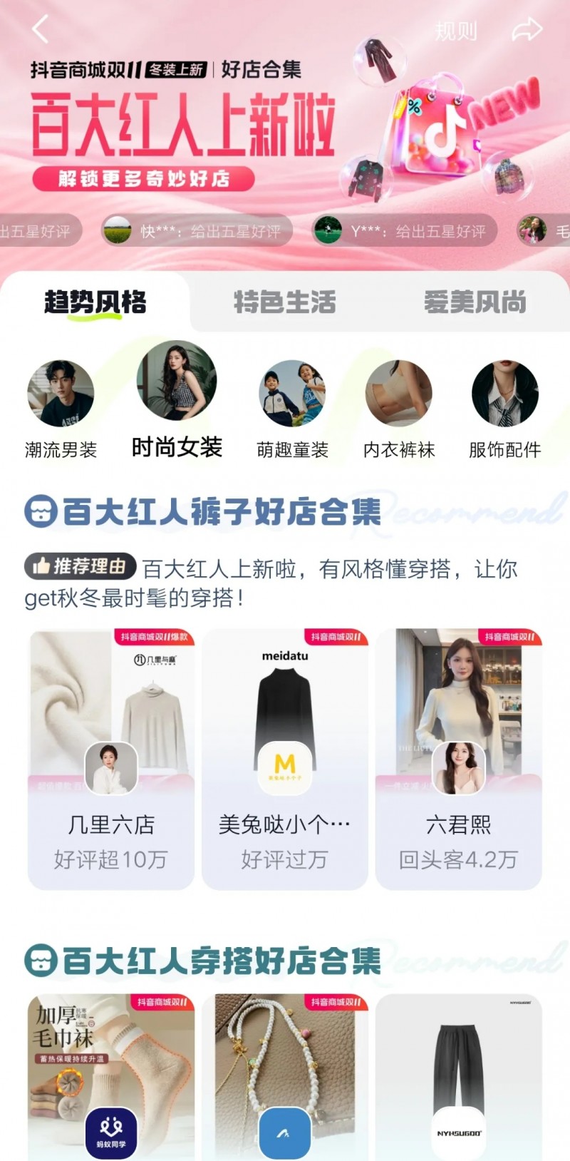 在抖音商城GMV同比增长91%、搜索GMV同比增长77%等核心数据之外,重点品类的表现亦被提及——比如通过「百大红人上新啦」活动,服饰商家中已经产生49个GMV破千万元的直播间。