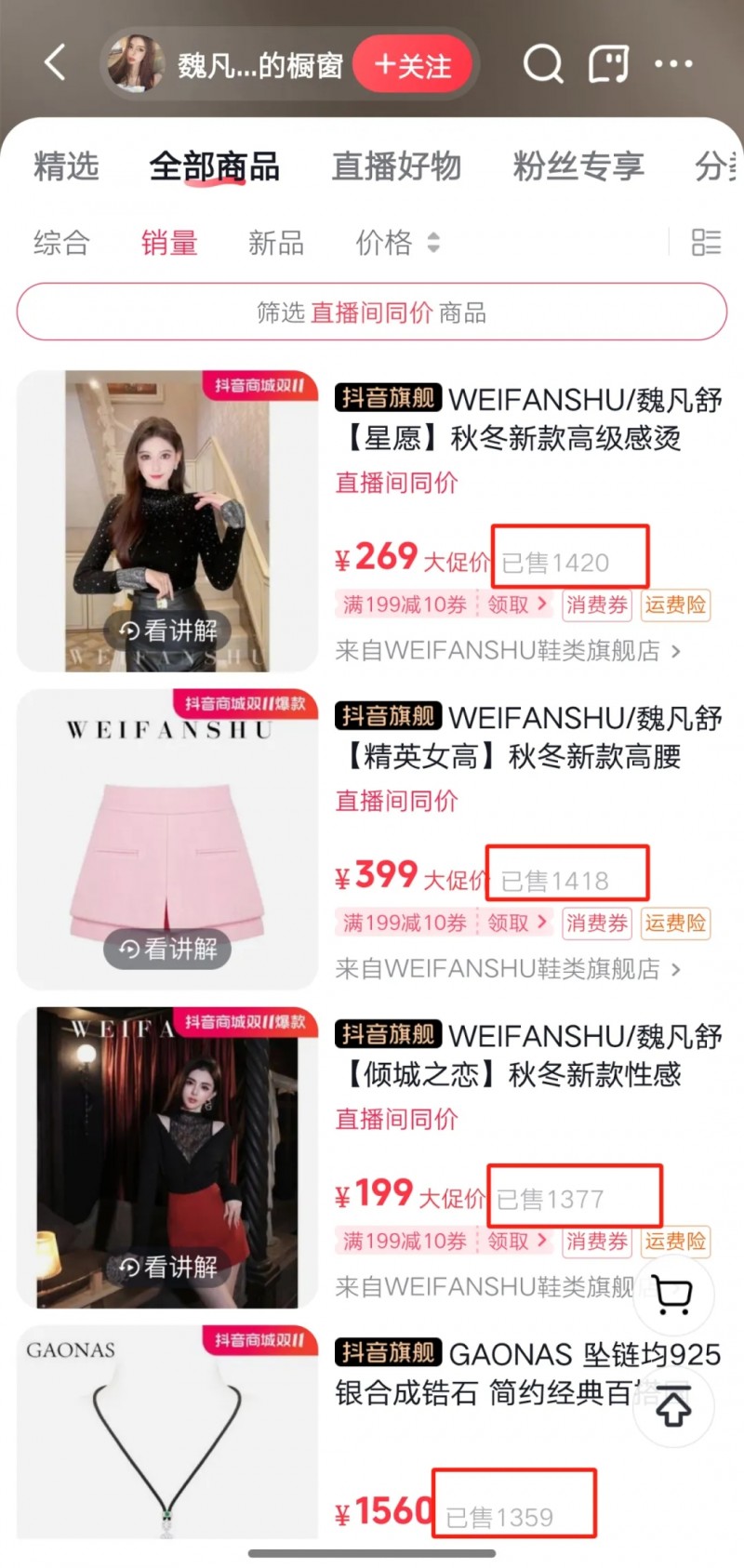 在报名抖音电商服饰「百大红人上新啦」活动后,魏凡舒的团队筹备了一批秋冬新款,从烟管皮裤、烫钻针织上衣到毛呢大衣、水貂外套、羽绒服,品类几乎涵盖秋冬换季所需的大部分场景,价格则从199元到2万多元不等。
