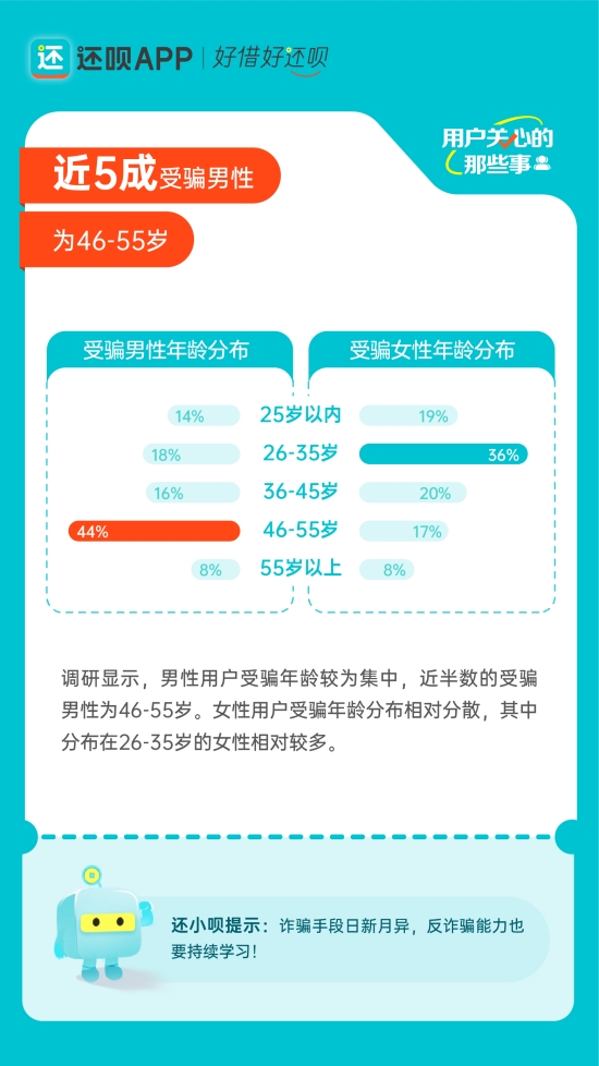 作为以用户为导向的APP,还呗不仅秉持“好借好还呗”的品牌理念,为用户打造多快好省的借贷体验,还全方位践行用户关怀。近期,面对日益严峻的金融诈骗形势,还呗聚焦用户关心的那些事,特别推出《还呗用户防范诈骗行为洞察报告》(以下简称《洞察报告》),通过性别视角的相关调研,洞察用户对金融安全的认知程度,从而通过流程机制和技术手段切实守护用户的“钱袋子”。