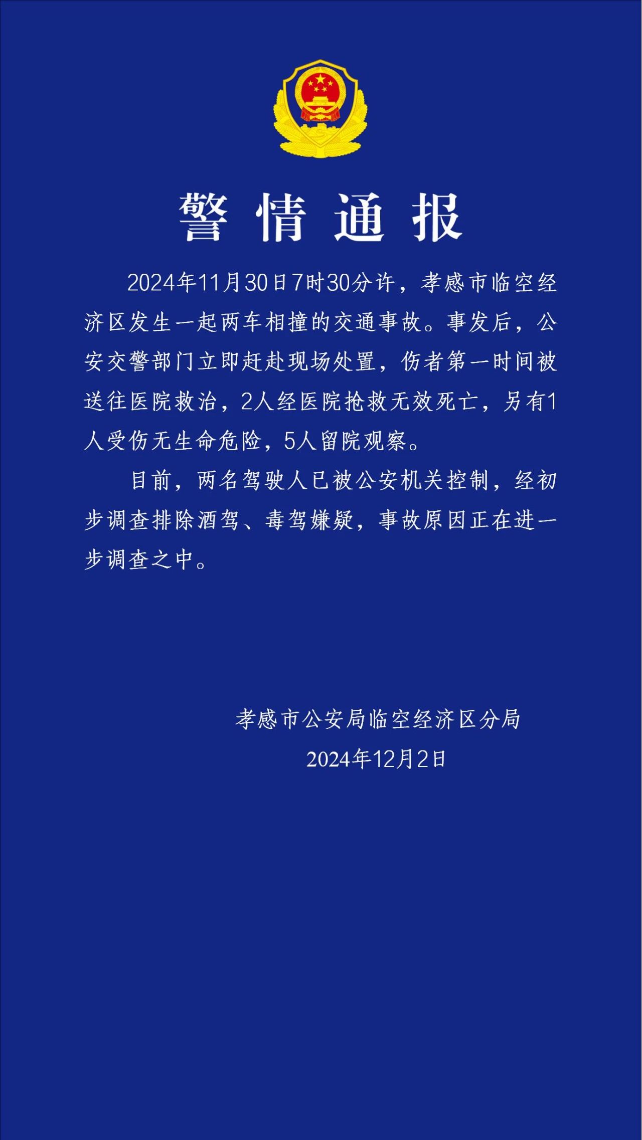 12月2日,湖北孝感市公安局临空经济区分局通报,11月30日7时30分许,孝感市临空经济区发生一起两车相撞的交通事故。事发后,公安交警部门立即赶赴现场处置,伤者第一时间被送往医院救治,2人经医院抢救无效死亡,另有1人受伤无生命危险,5人留院观察。目前,两名驾驶人已被公安机关控制,经初步调查排除酒驾、毒驾嫌疑,事故原因正在进一步调查之中。