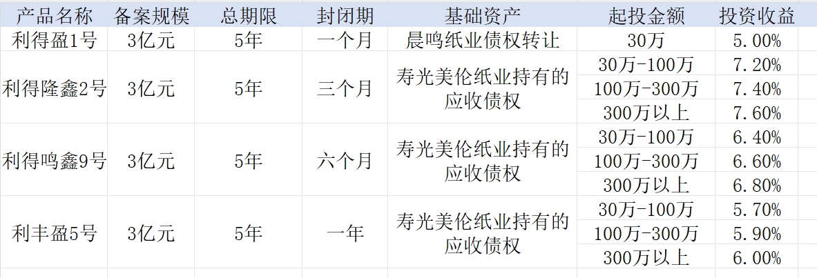 根据利得基金销售公司的产品资料,界面新闻记者发现,包括利得盈1号、利得隆鑫2号、利得鸣鑫9号、利丰盈5号等4个私募产品和晨鸣纸业及子公司的应收债权有关。上述4个产品的备案规模均是3亿元,存续期均是5年。随着投资金额的不同,产品预计的业绩比较基准不同。