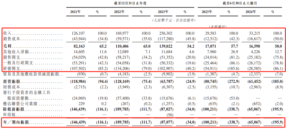 招股书显示,2021年、2022年、2023年和2024年前6个月(统称“报告期内”),51WORLD实现收入分别为1.26亿元、1.7亿元、2.56亿元和3321.5万元;对应期内亏损分别为1.46亿元、1.9亿元、8707.7万元和6506.7万元,近三年半累计亏损约4.88亿元;期间毛利率分别是65.2%、65%、54.2%及50%。