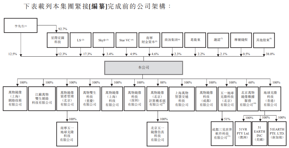 51WORLD于2015年2月成立,自称是“一家致力于克隆地球5.1亿平方公里的科技公司”,并是“中国数字孪生行业的引领者”。截至最后实际可行日期,公司执行董事、董事会主席兼总经理李熠持有公司直接权益约12.5%,加上通过控股92.7%的星际宏图科技持股约12.3%,李熠合计拥有公司约24.7%的权益。