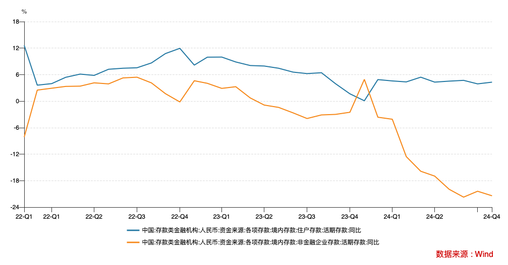 “近年居民消费、购房不活跃,影响了存款从居民部门向企业部门回流。由于对可支配收入及现金流信心不足,在保留有限应急的活期存款的前提下,企业和居民会优先选择定期存款锁定即将下调的利率。”某国有大行资产负债部人士表示。