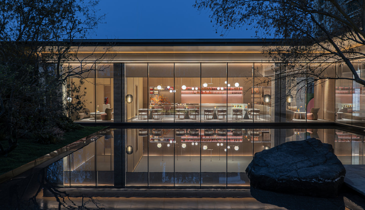 主题化“泛会所”社交空间 一楼架空层被巧妙设计成健身运动、亲子阅读等不同主题盒子,配置以玻璃幕,并与室外的林下会客厅、廊架空间等呼应,共同构建使用场景多元化的社交场,妥帖照料业主的各种社交需求。