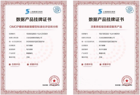 近日,由万达信息自主研发的数据服务产品“OMOP糖尿病数据模型标准化评估和分析”和数据应用产品“灵素体检报告解读服务产品”成功通过合规评估和质量评估,在上海数据交易所挂牌。