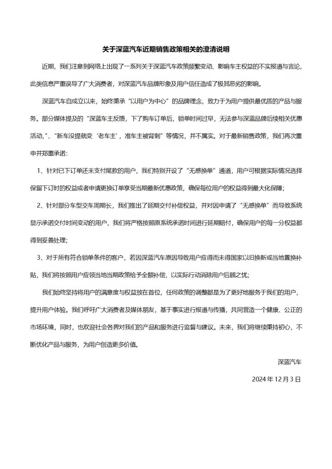 对于最新销售政策,公司重申并承诺:针对已下订单还未支付尾款的用户,公司开设了“无感换单”通道,用户可根据实际情况选择保留下订时的权益或者申请更换订单享受当期最新优惠政策;针对部分车型交车周期长,公司推出了延期交付补偿权益,并对因申请了“无感换单”而导致系统显示承诺交付时间变动的用户,公司将严格按照原系统承诺时间进行延期赔付;对于所有符合锁单条件的客户,若因深蓝汽车原因导致用户应得而未得国家以旧换新或当地置换补贴,公司将按照用户应领当地当期政策给予全额补偿。