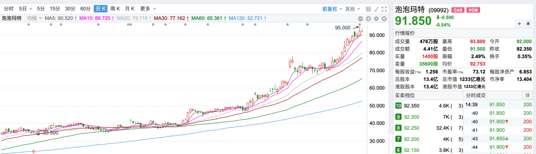 比起这些小打小闹的“炒谷子”,资本市场的故事显然更加刺激。人们熟知的泡泡玛特,股价从年初的16.75港元,来到了当下的95港元。