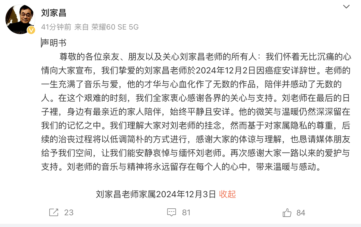 12月3日,据刘家昌微博声明,知名音乐人刘家昌已于12月2日因癌症病逝,享年83岁。声明称“刘老师在最后的日子里,身边有最亲近的家人陪伴,始终平静且安详。”