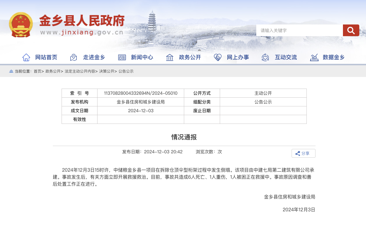 山东济宁金乡县住房和城乡建设局通报,12月3日15时许,中储粮金乡县一项目在拆除仓顶伞型桁架过程中发生倒塌。该项目由中建七局第二建筑有限公司承建。事故发生后,有关方面立即开展救援救治。目前,事故共造成6人死亡、1人重伤,1人被困正在救援中。事故原因调查和善后处置工作正在进行。