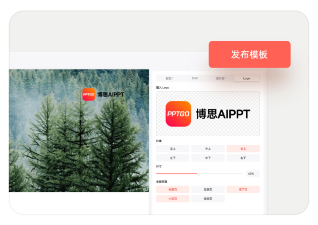 本次上新的自定义模板功能,博思AIPPT支持全局调整PPT模板的LOGO、配色、字体和素材包,满足用户创建个性化PPT模板的各种需求,以其中的自定义LOGO为例,可上传企业的LOGO图标或品牌VI,上传后支持调整LOGO的大小、位置和显示LOGO的页面,基于博思AIPPT官方模板来自定义企业PPT模板,极大降低了PPT制作门槛,同时便于后期的维护和更新。