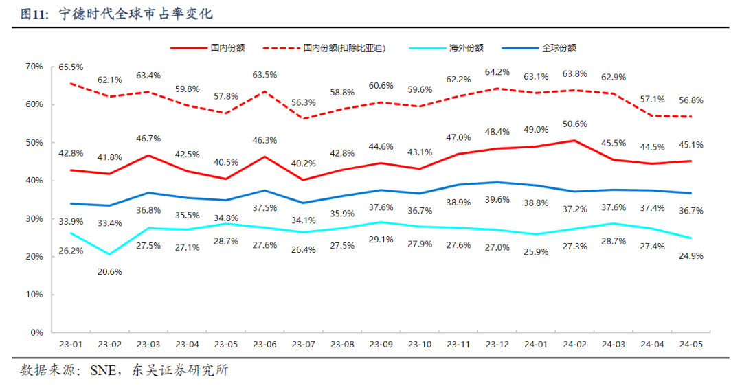 宁德时代的国内市占率在 2021 年高达 52.1%,而自 2022 年起,宁德时代的国内市占率首次跌破 50% 这一重要关口后,稳定在 40% 到 50% 左右。