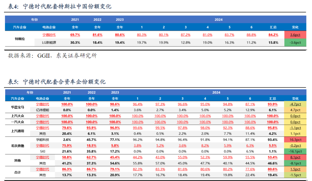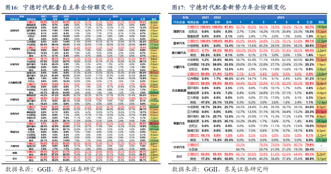总的来说,2021-2023 年期间,在合资企业的电池供应中,宁德时代仍然强势,份额稳定在 80%上下,仅有些许下滑;在自主车企的订单获取上较为稳定,份额在 40-50% 之间摇摆。