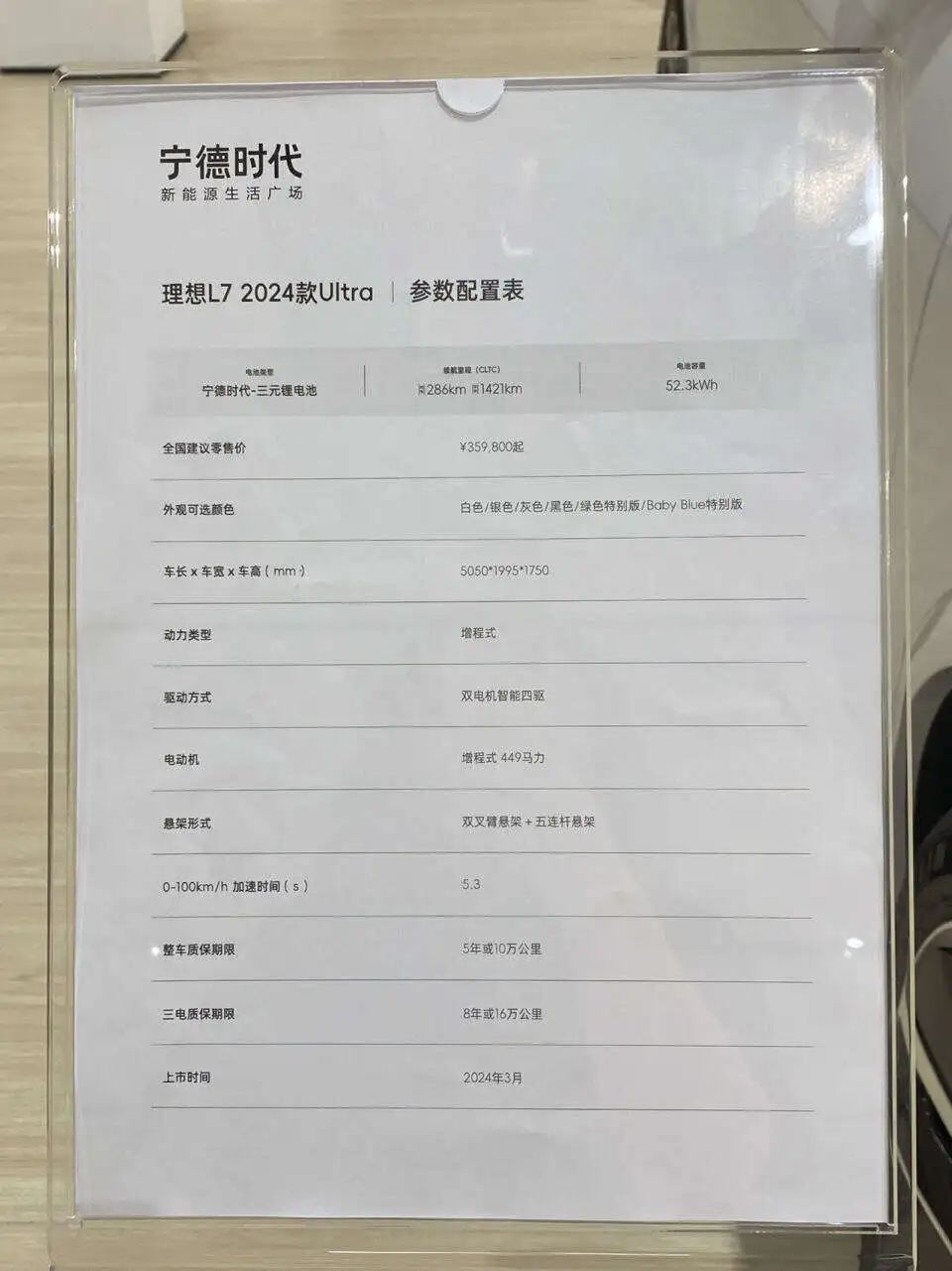 与常规的车企线下门店的参数配置表信息不同,在宁德时代新能源生活广场中所展示的新能源汽车的参数配置表,一开头便用表格说明了对应车型所搭载的宁德时代电池类型、续航里程、电池容量等信息。