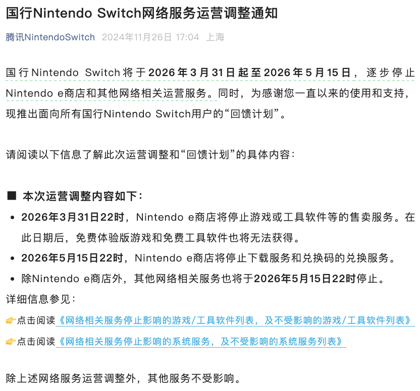 2026年3月31日—5月15日,国行Switch e商店和其他网络相关运营服务将逐步关停。