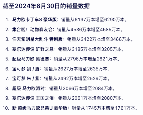 主机游戏玩家偏爱大作,而Switch的生态是以任天堂出品的游戏为主,比如马里奥与宝可梦两大IP,以及前文提到的塞尔达和动森,这些IP霸占了Switch历史销量前十的榜单。