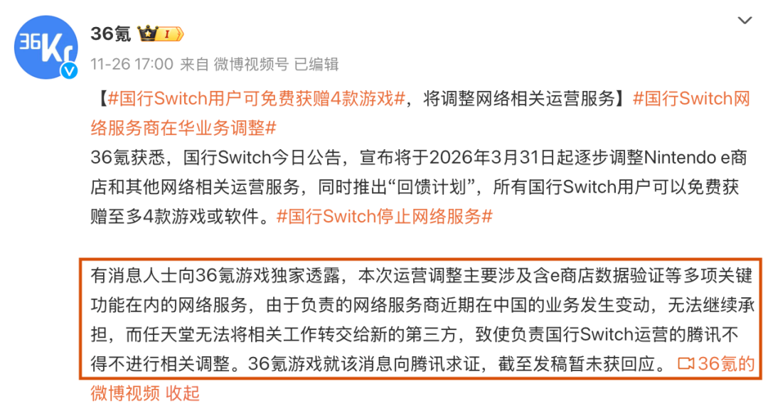 11月底,随着腾讯Nintendo Switch的一纸公告,“国行Switch停止网络服务”的词条冲上了热搜。