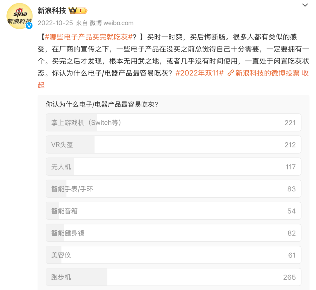 当时,Switch的全球销量已经破亿,半年一次充电提醒被忠实玩家视为“顽梗”和“自嘲”。但新浪的反应很快,迅速推出了一则投票,Switch在“最容易吃灰的电子产品”中排在第二,排在第一的跑步机更像是被派来挽尊的。