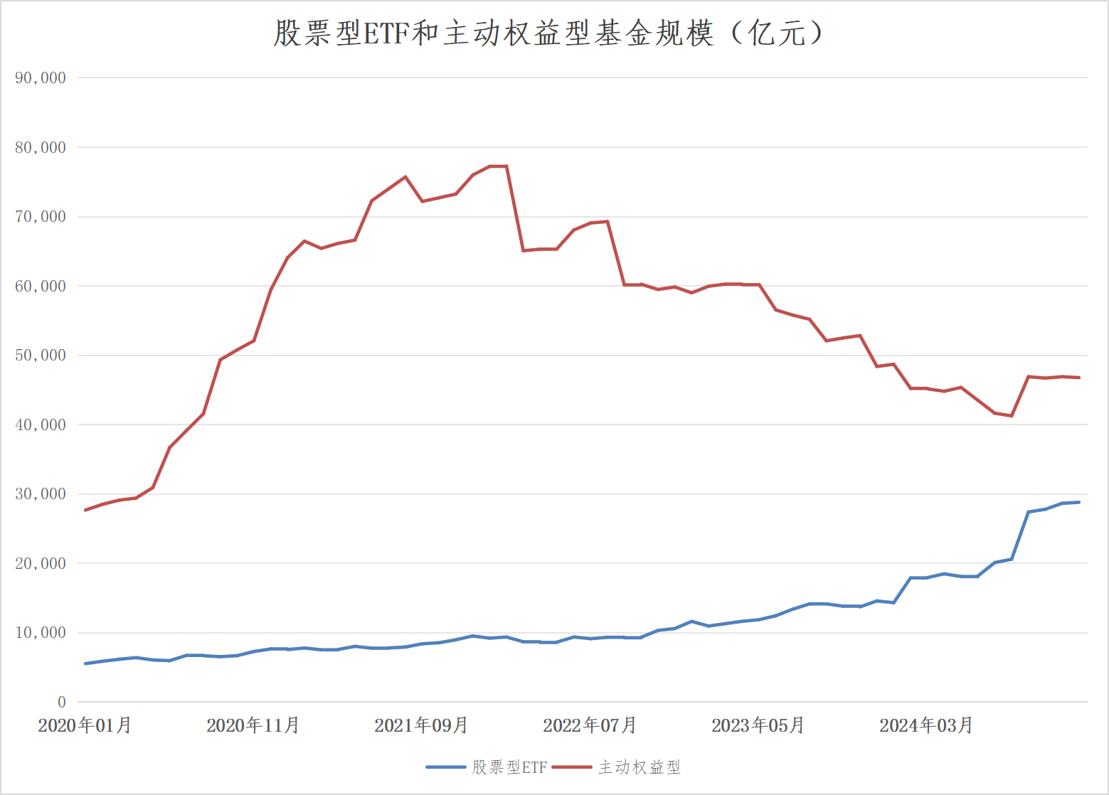 与此同时,主动型权益类基金的总规模(即股票型基金资产净值+混合型基金资产净值-股票型ETF资产净值)则是在2022年2月达到7.72万亿元峰值后逐步回落,截至今年8月底时总规模一度回落至仅为4.12万亿元,相较于此前峰值缩水46.64%,直到9月份随着市场行情转好才重新回升至4.69万亿元,不过截至12月初,其规模又有一定程度的回落,最新总规模为4.67万亿元。