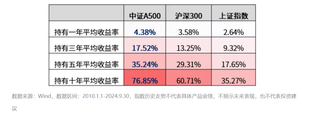 资金震荡市逢低布局核心资产,相比过往传统宽基指数以市值考量成份股,中证A500考虑行业均衡、ESG、互联互通等更多因素,在指数成份股选样和权重分配上做出了优化。据华夏基金策略团队回测,自2010年起,任意时点布局中证 A500指数(000510.SH),随着持有期限的拉长,平均收益率会有一个较大的提升,且好于上证指数、沪深300。