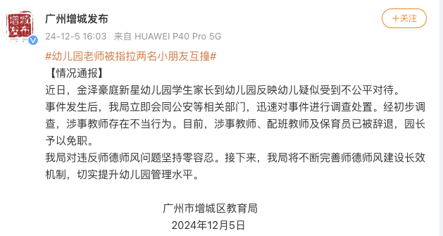 12月5日,广州市增城区教育局通报,近日,金泽豪庭新星幼儿园学生家长到幼儿园反映幼儿疑似受到不公平对待。事件发生后,教育局立即会同公安等相关部门,迅速对事件进行调查处置。经初步调查,涉事教师存在不当行为。目前,涉事教师、配班教师及保育员已被辞退,园长予以免职。