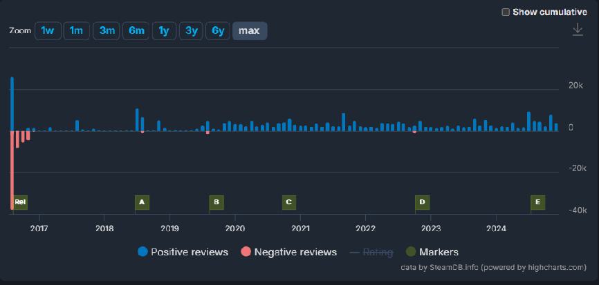 这一“特别好评”建立于二十五万余条玩家评价,跨越八年时间,最终证明了这款曾获得过2020年TGA最佳持续运营奖的产品,称得上是游戏界少见的出师不利,却实现“三十年河东,三十年河西”的案例。