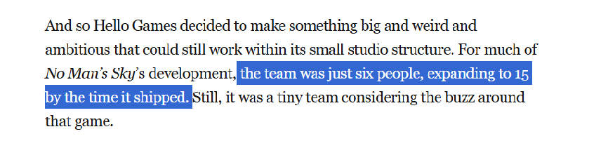 另一方面,与宣传中庞大体量截然相反的,是Hello Games当年仅15人的工作室规模,并且,在一些采访中,团队创始人仅6人开发《无人深空》的消息,更使得舆论将这款游戏送上神坛。