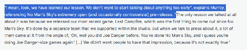 《无人深空》的营销失控教训对于Hello Games是深刻的,2020年,在发布了由三人开发的小体量游戏《最后的篝火》后,西恩等人提前披露了工作室的下一款游戏,当时他们表示“已经吸取了《无人深空》的教训,不打算透露更多的细节。”