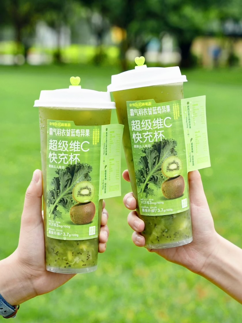 今年7月,喜茶推出首款“羽衣纤体瓶”,它以绿研茶汤为茶底,搭配羽衣甘蓝、奇亚籽以及苹果、黄柠檬等蔬果。为了推广这款产品,喜茶还趁着奥运会热度与安踏的冠军龙服联名营销,让这款新品上线一个半月就售出1000万瓶。随后,喜茶趁势陆续推出了以苦瓜、红菜头等为主打的系列产品。