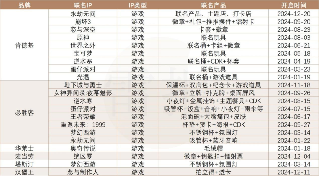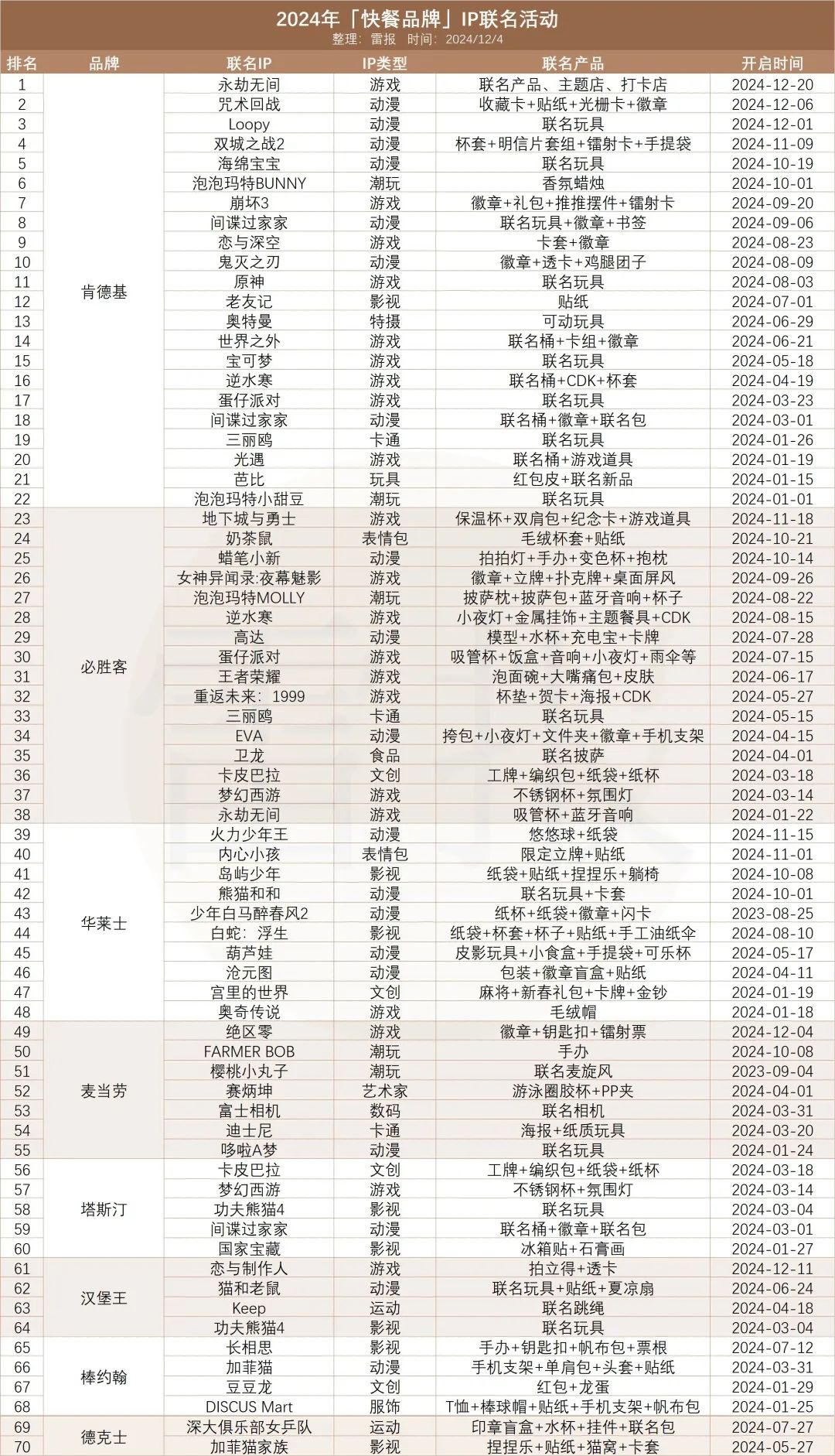 以2024年全年的70个快餐联名活动作为样本(人工统计存在误差),可以发现: