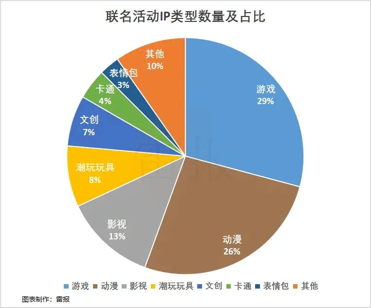 具体到IP方面,这些快餐品牌都倾向于选择哪些IP?通过分类统计,游戏IP(21次)和动漫IP(19次)是快餐联名届的“香饽饽”,合作次数遥遥领先,且仅这两大类就总计占比超过了半数。