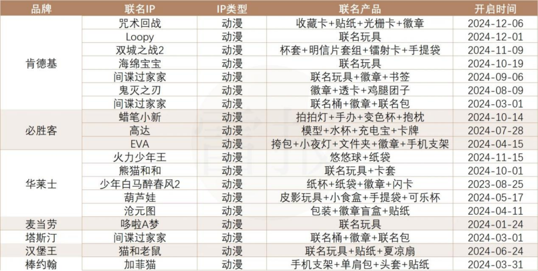 动漫IP方面,日漫IP受到大部分的快餐品牌青睐,《咒术回战》《间谍过家家》《鬼灭之刃》等近年新晋顶流日漫和《蜡笔小新》《高达》《EVA》等经典IP平分秋色。