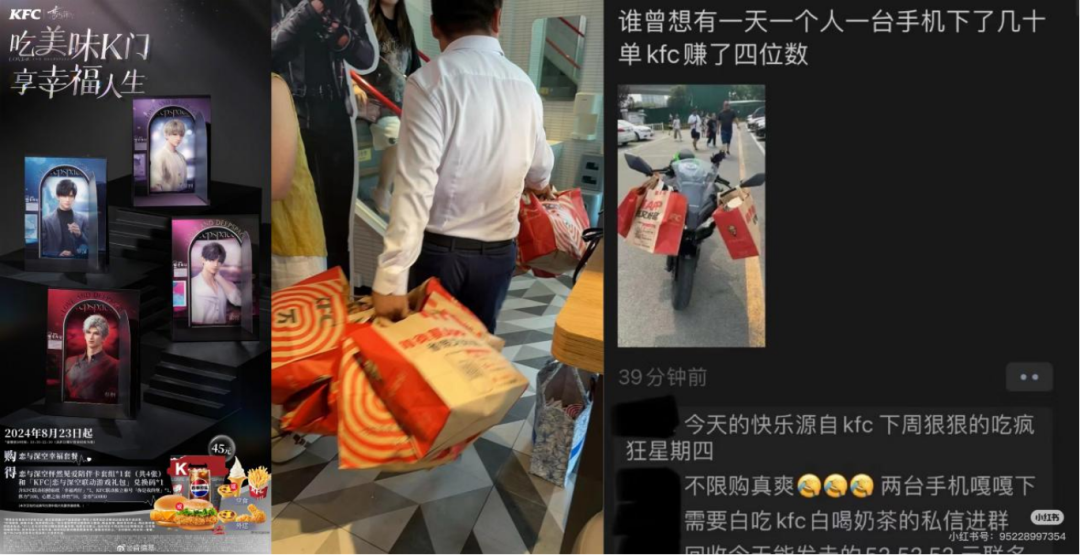 8月,肯德基与《恋与深空》联名大火,附赠IP周边的两个套餐售价分别为45元与52元、限量90万份和20万份,活动一经开启便瞬间售罄,仅这部分的即时销售额就超过5000万元,肯德基APP也因为粉丝过于热情而被挤到瘫痪,#肯德基崩了#话题冲上微博热搜。该活动甚至引发大量“代购”“黄牛”现象,互联网上一度传出“当KFC联名周边黄牛日入四位数”的话题。
