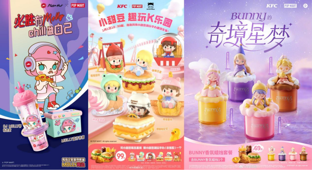 除了三丽鸥、chiiikawa等潮流IP没有缺席外,随着泡泡玛特在近两年开启频繁联名之路,今年快餐品牌们也与泡泡玛特的IP擦出了不少“火花”,旗下的BUNNY、MOLLY、小甜豆等IP与肯德基、必胜客都有联名合作。以必胜客为例,包含MOLLY主题系列周边的两款套餐的价格分别在159元以及279元,较高的定价并没有影响消费者热情,在年轻顾客中迅速掀起一阵美食潮玩风潮。