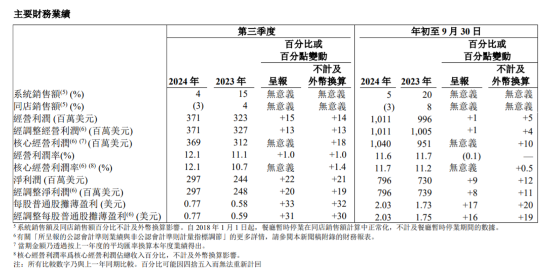 肯德基、必胜客的母公司“百胜中国”在11月4日发布了2024年第三季度财务报告,数据显示,该季度,公司实现营收30.71亿美元,同比增长5%;净利润为2.97亿美元,同比增长22%;经营利润率为12.1%,较去年提升了100个基点。