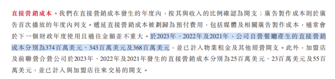 百胜中国对营销的重视也体现在日益上升的直接营销成本上。在更为详尽的2023年年度报告中,数据显示,2023年、2022年及2021年,百胜中国直接营销成本分别为37.4亿美元(约合人民币270亿元)、34.3亿美元以及36.8亿美元,而这项成本在2020年时还只有30.7亿美元(约合人民币210亿元)。