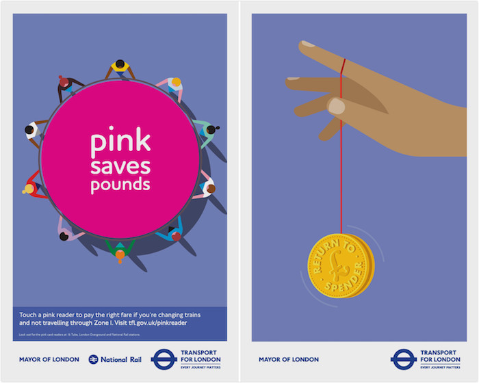 最近几周,伦敦大大小小的地铁站陆陆续续都摆上了全新的宣传海报。图像内容涵盖交通卡、收费政策、换乘服务、慈善活动等角度,画面颜色明亮,构图简单,不管是走过路过匆匆一瞥,又或是驻足停留死死盯上一会儿,想必都会心情舒畅。