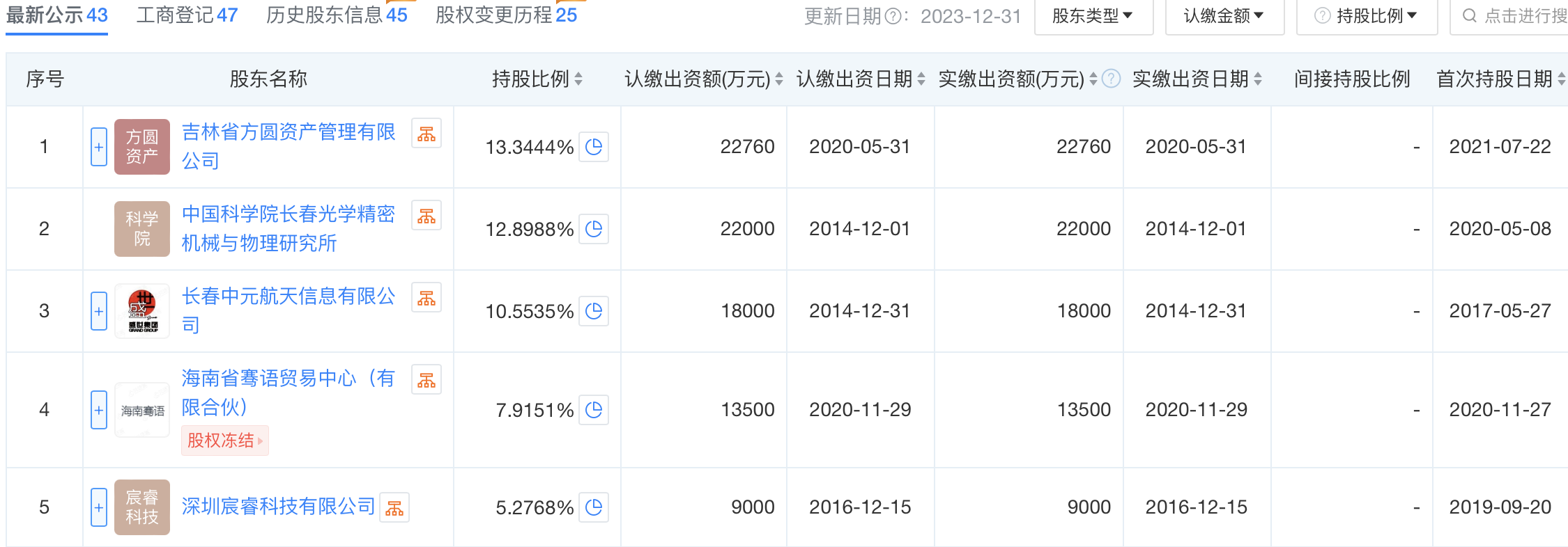 天眼查显示,长光卫星目前最大股东为吉林省方圆资产管理有限公司,后者是吉林省国有资本控股企业,持股比例约13.3%;第二大股东是中国科学院长春光学精密机械与物理研究所,持股比例为12.9%。
