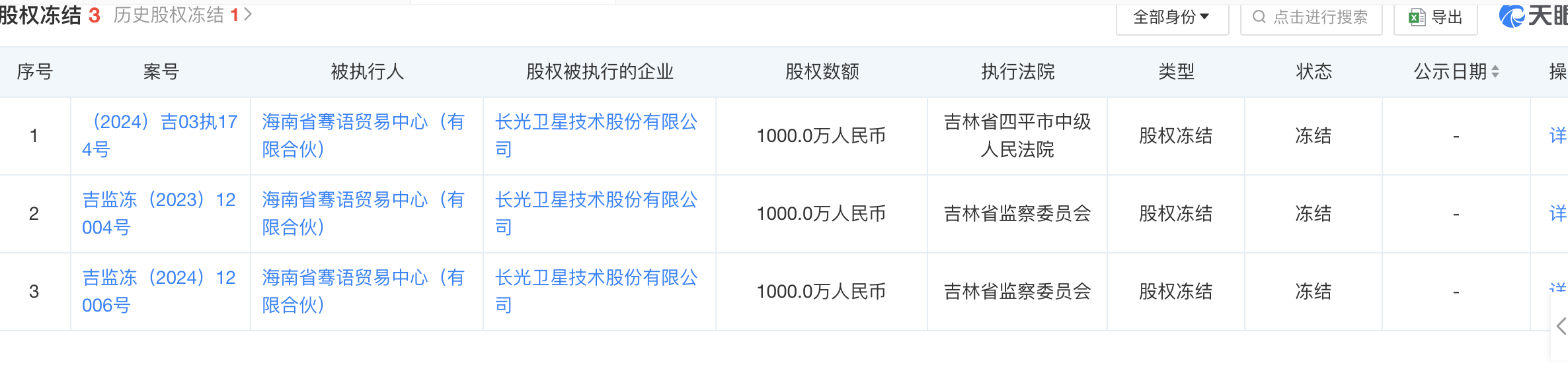 据天眼查显示,长光卫星确实存在股权冻结情况。三起案件被执行人均为海南省骞语贸易中心(有限合伙)公司(下称骞语贸易),共涉及长光卫星股权数额3000万元。