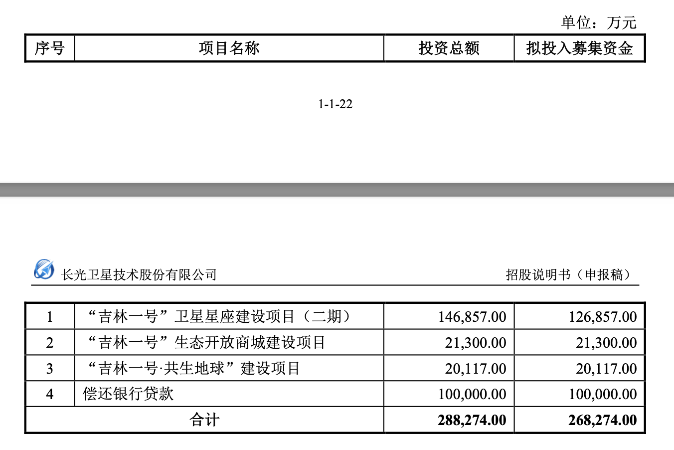 长光卫星原计划通过IPO,发行不超过2.3亿股,募资26.8亿元。扣除发行费用后,将投资于“吉林一号”卫星星座建设项目(二期)、“吉林一号”生态开放商城建设项目、“吉林一号·共生地球”建设项目以及偿还银行贷款。