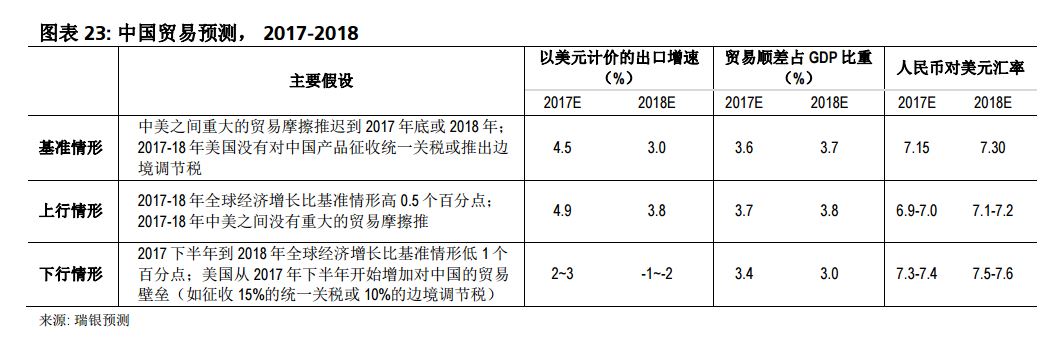 如果特朗普政府在2017年下半年开始增加对中国的贸易壁垒(如征收15%的统一关税或10%的边境调节税),我们预计今年中国实际出口增速可能较基准情形下降1.5个百分点、明年下降3-4个百分点。出口需求恶化会抑制加工贸易进口,但一般贸易进口可能受益于政府加码政策支持以抵消外部冲击。在下行情形下,中国贸易顺差将有所降低,人民币汇率面临更大的下行风险,2017年底可能贬至7.3-7.4,2018年底贬至7.5-7.6。