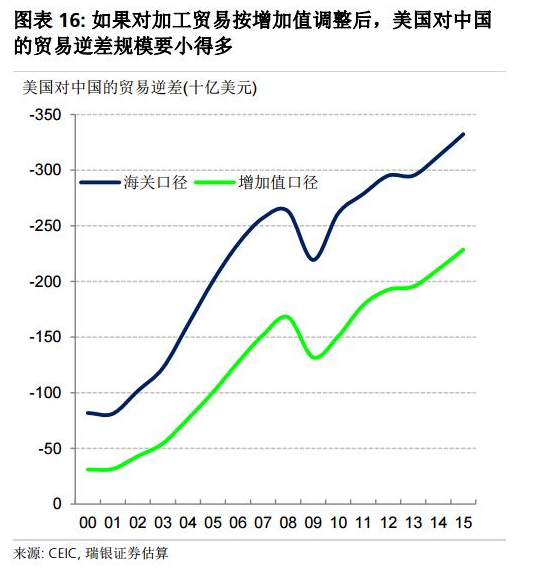 虽然中国对美国的贸易顺差规模很大,但大陆地区对台湾地区、韩国和德国等地区的贸易逆差也很可观。按用于对方最终需求的出口的国内增加值计算,2015年美国对中国的货物及服务贸易逆差约为2290亿美元,比其名义总贸易逆差3320亿美元低31%左右。也就是说,在全球供应链一体化的背景下,中国在双边贸易失衡中的贡献可能被夸大。