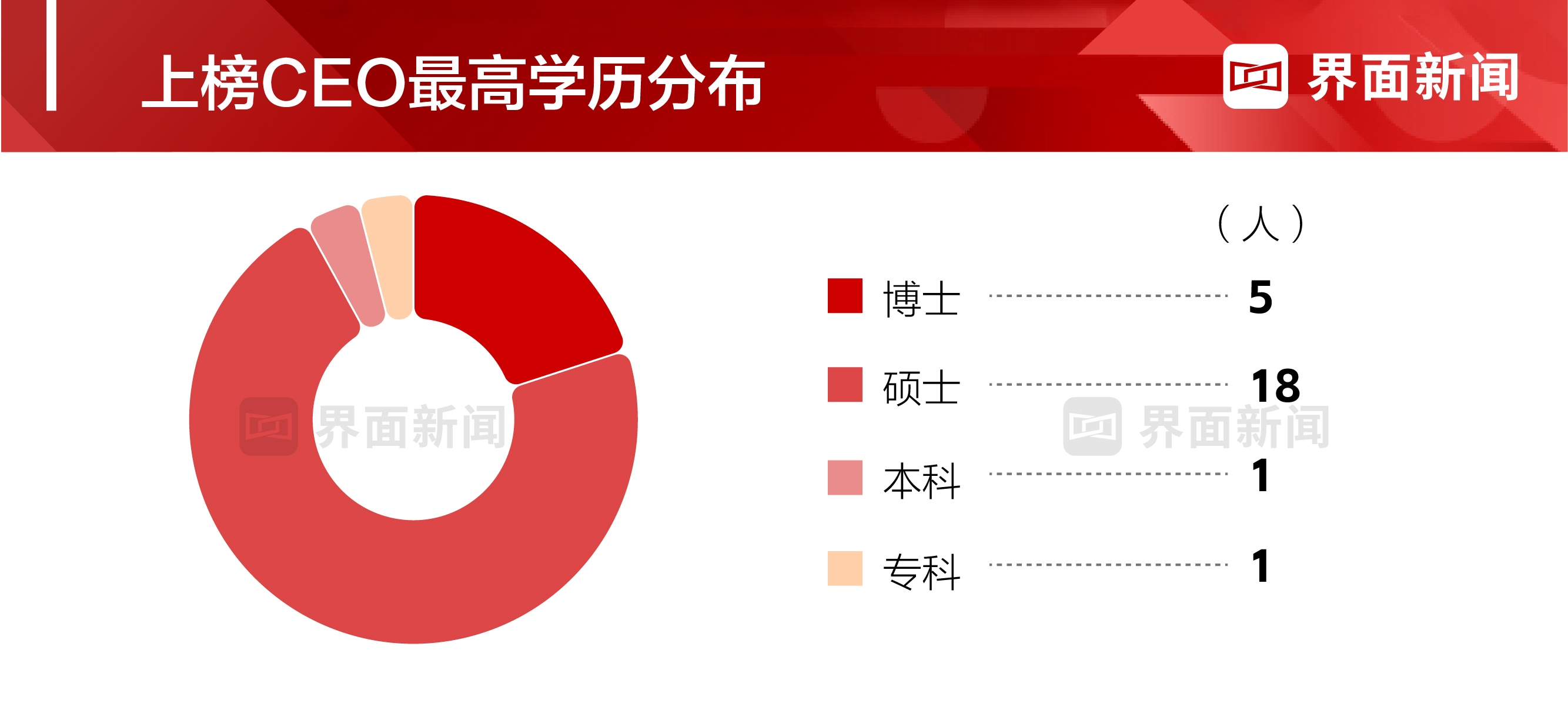 医疗健康行业涉及生命科学、医学、药学等多个高度专业化的领域,同时对科技创新有着极高的要求。因此,企业高管的学历背景也备受关注。25位上榜CEO中,最高学历为硕士及以上的有23人,占比高达92%,其中硕士18人,博士5人。