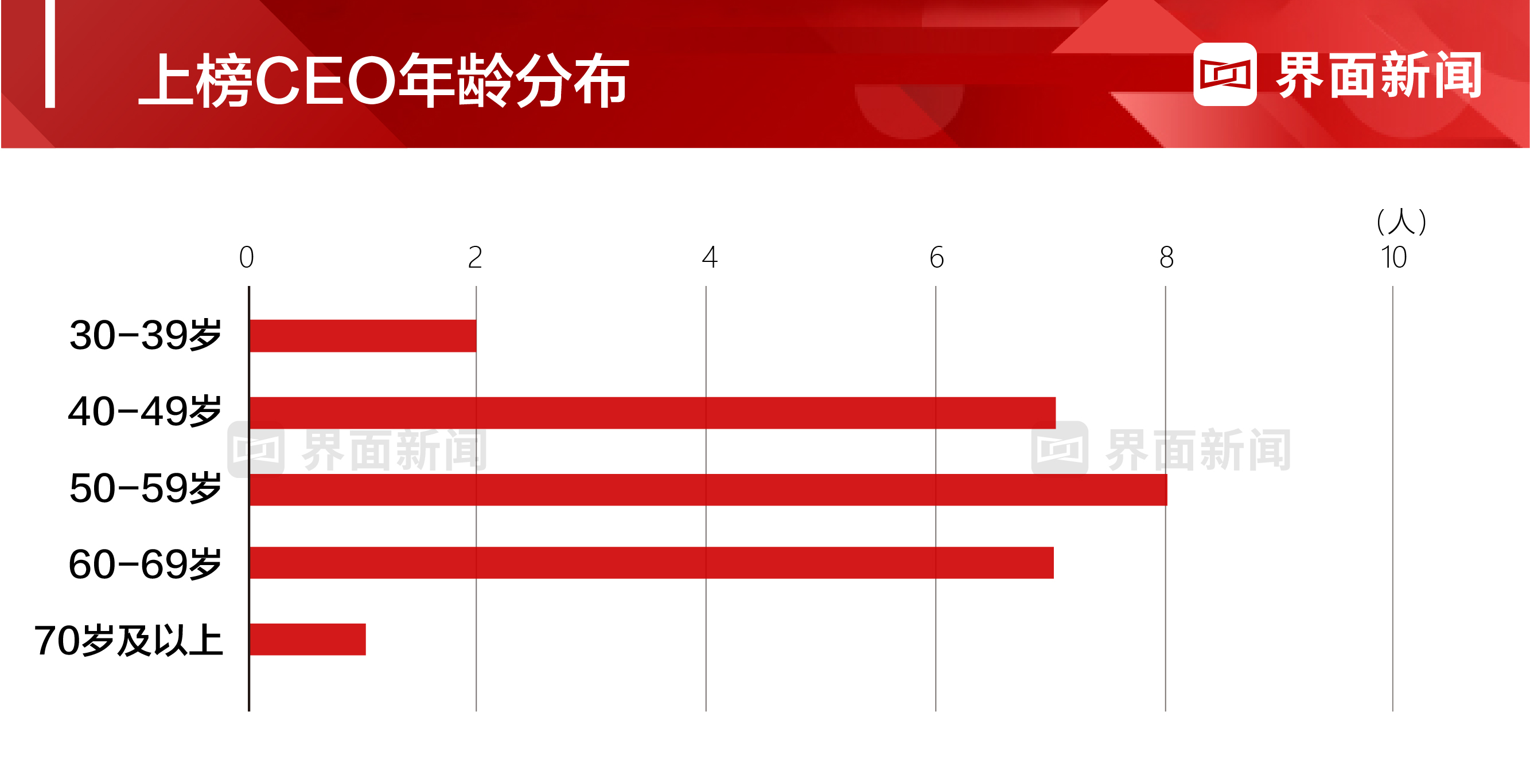 25位上榜CEO的平均年龄为53岁。其中,最年轻的当属鱼跃医疗的董事长兼总经理吴群,今年36岁。本届榜单上共出现了3位女性CEO,她们分别是英诺特总经理张秀杰、海思科总经理范秀莲,和瀚森制药董事会主席兼首席执行官钟慧娟。